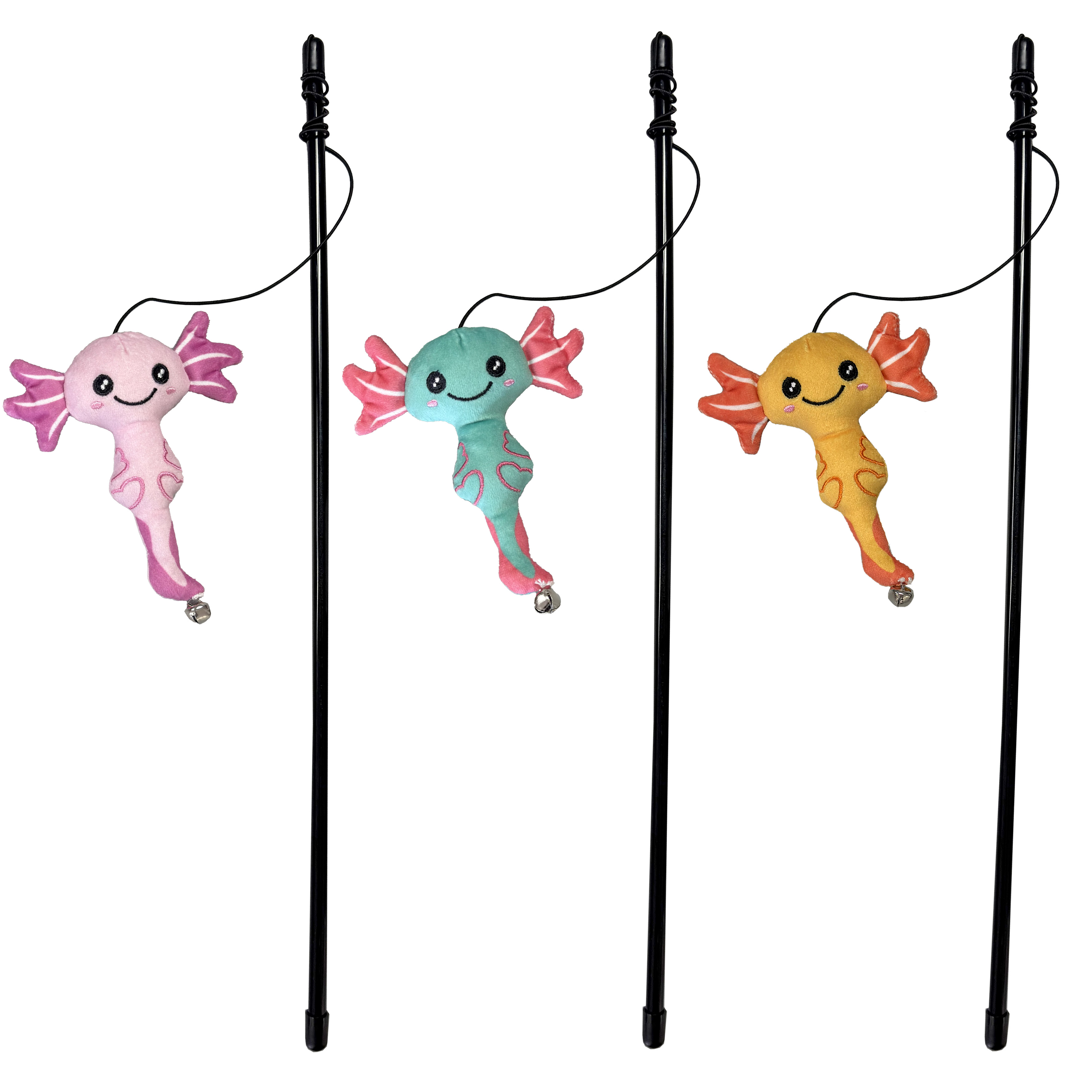 Squiggles, wiggles & pounces await! The Axolotl Squiggles teaser wand is packed with a catnip + silvervine blend, crinkle sounds, and playful wiggles to keep cats leaping, batting and pouncing all day long. Tinkling bell adds an extra jingle to every pounce. Encourages exercise and satisfies natural hunting instincts. Promotes interactive bonding between you and your cat.