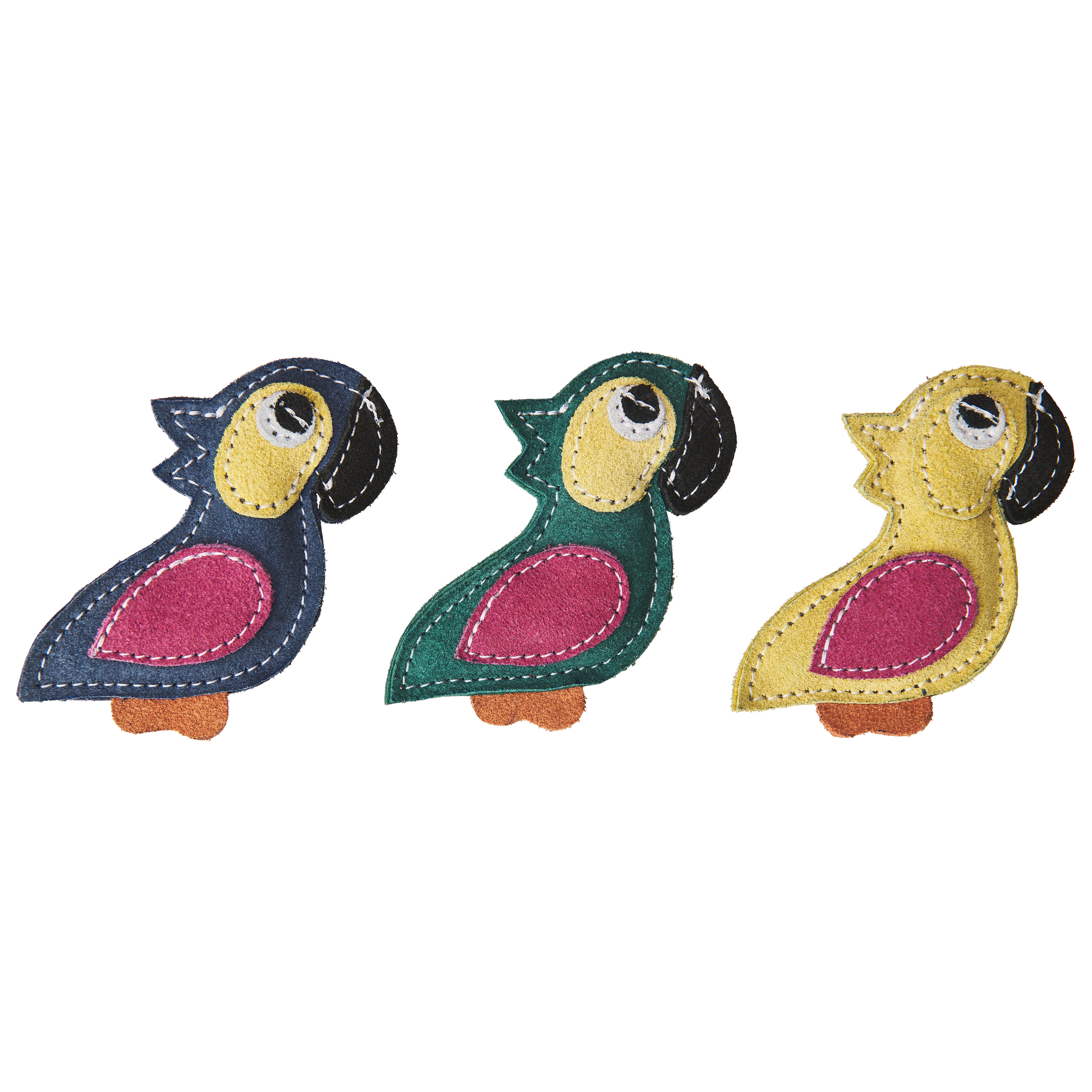Bring out your cat’s playful side with Dura-Fused leather parrot cat toys. Crafted with real, durable tan leather accented in vibrant blues, pinks and greens, each toy is as eye-catching as it is tough. Infused with catnip for added excitement, the rugged textures and enticing scents encourage batting, pouncing and chasing providing long-lasting fun.
