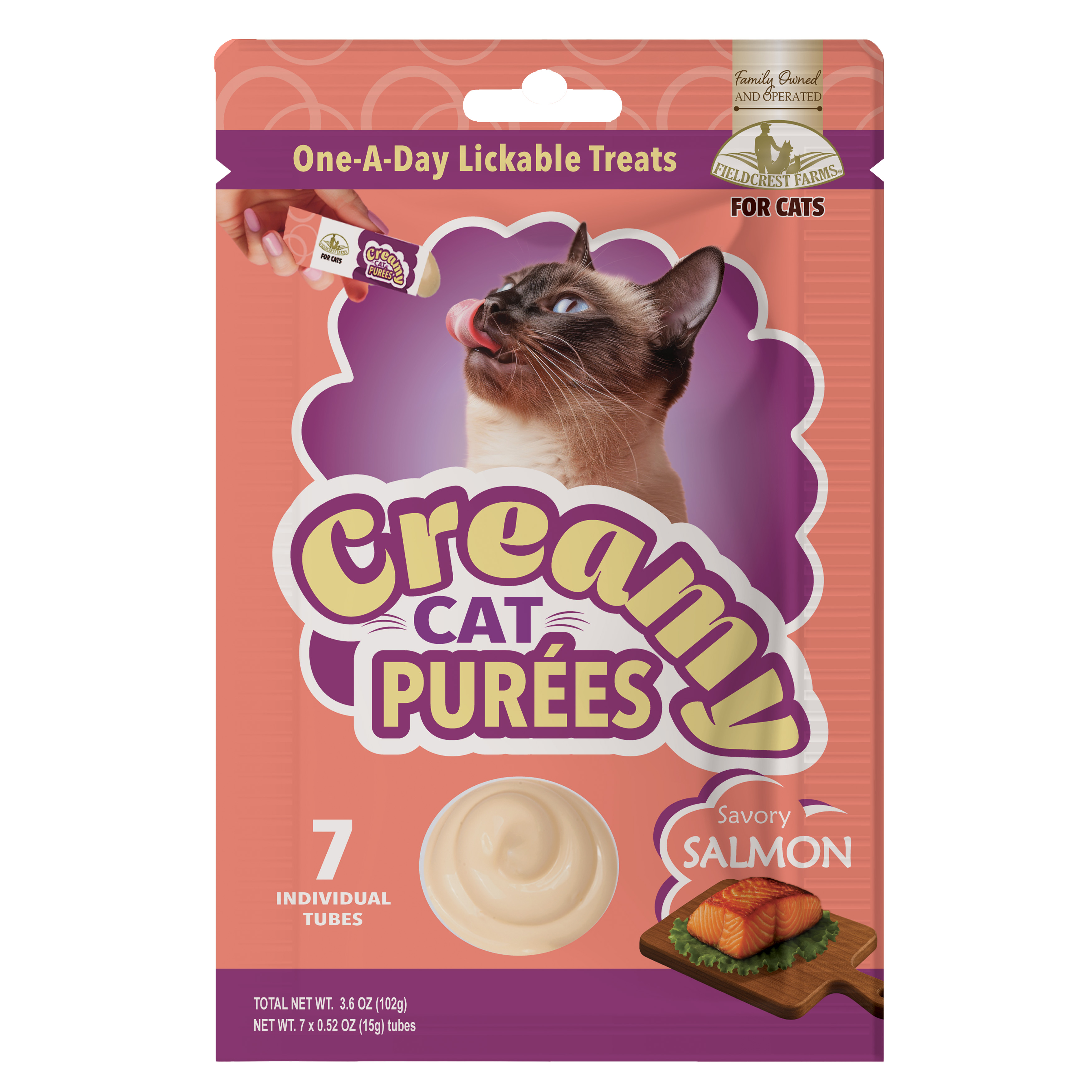 Treat your feline friend to an irresistibly creamy delight! Perfect for bonding, rewarding or simply spoiling your cat. Our easy-squeeze tubes ensure a hydrating, mess-free treat anytime, anywhere. Feed your cat one treat a day with our 7 pack salmon purees.