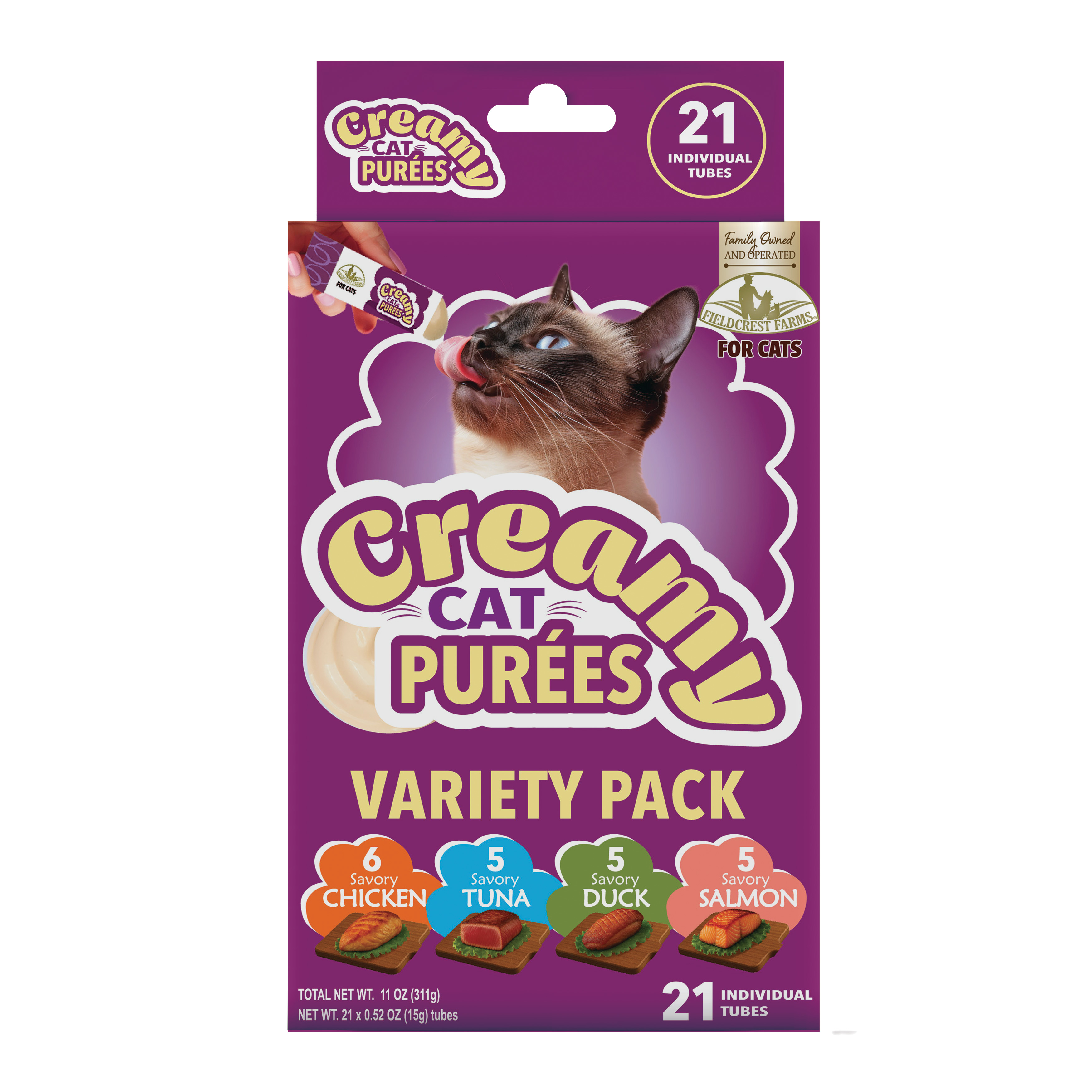 Treat your feline friend to an irresistibly creamy delight! Perfect for bonding, rewarding or simply spoiling your cat. Our easy-squeeze tubes ensure a hydrating, mess-free treat anytime, anywhere. 21 tubes of assorted flavors in a box. 6 chicken tubes, 5 tuna tubes, 5 salmon tubes, and 5 duck tubes per box.
