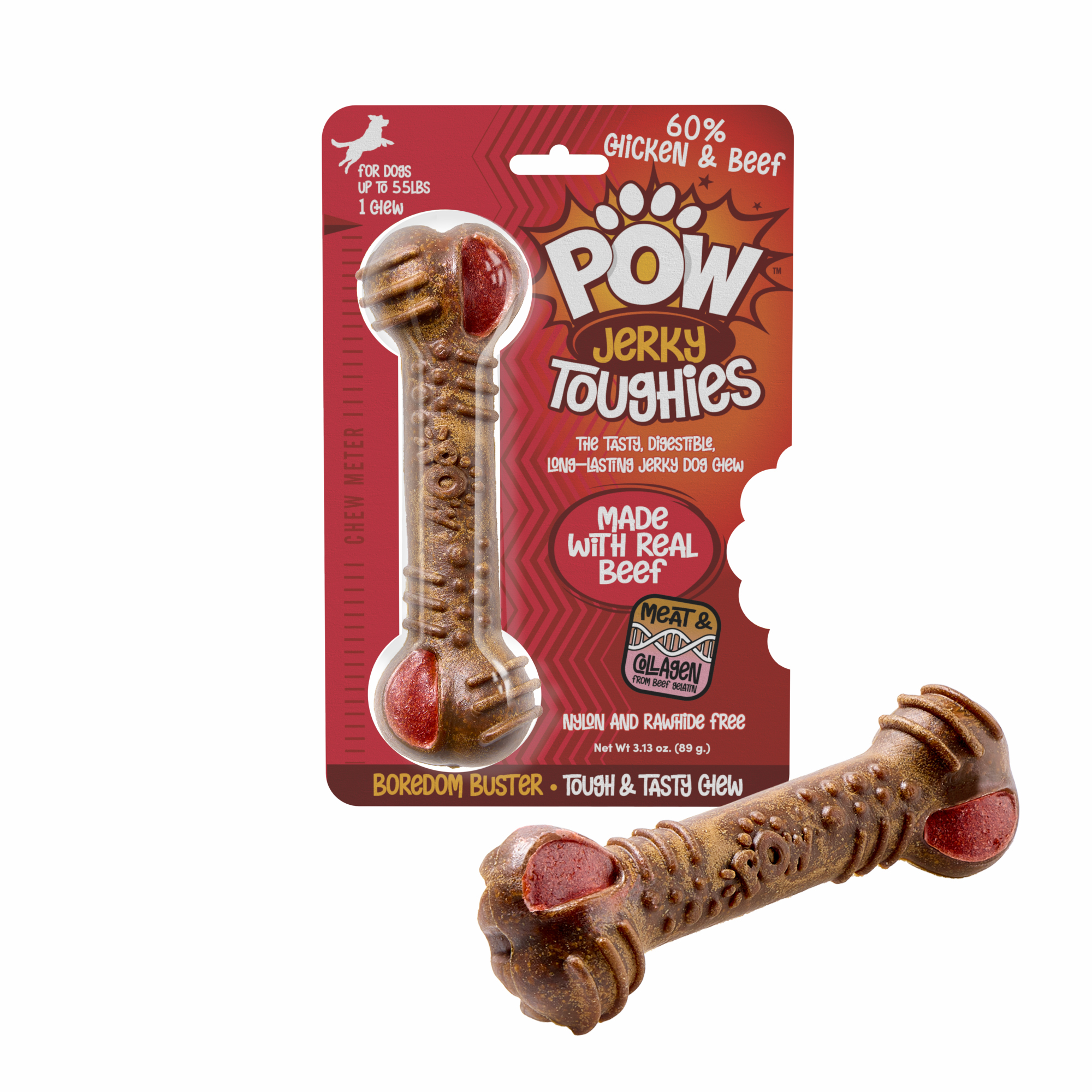 The tasty, digestible, longer lasting jerky dog chew. Made with meat and collagen, 100% nylon and rawhide free.