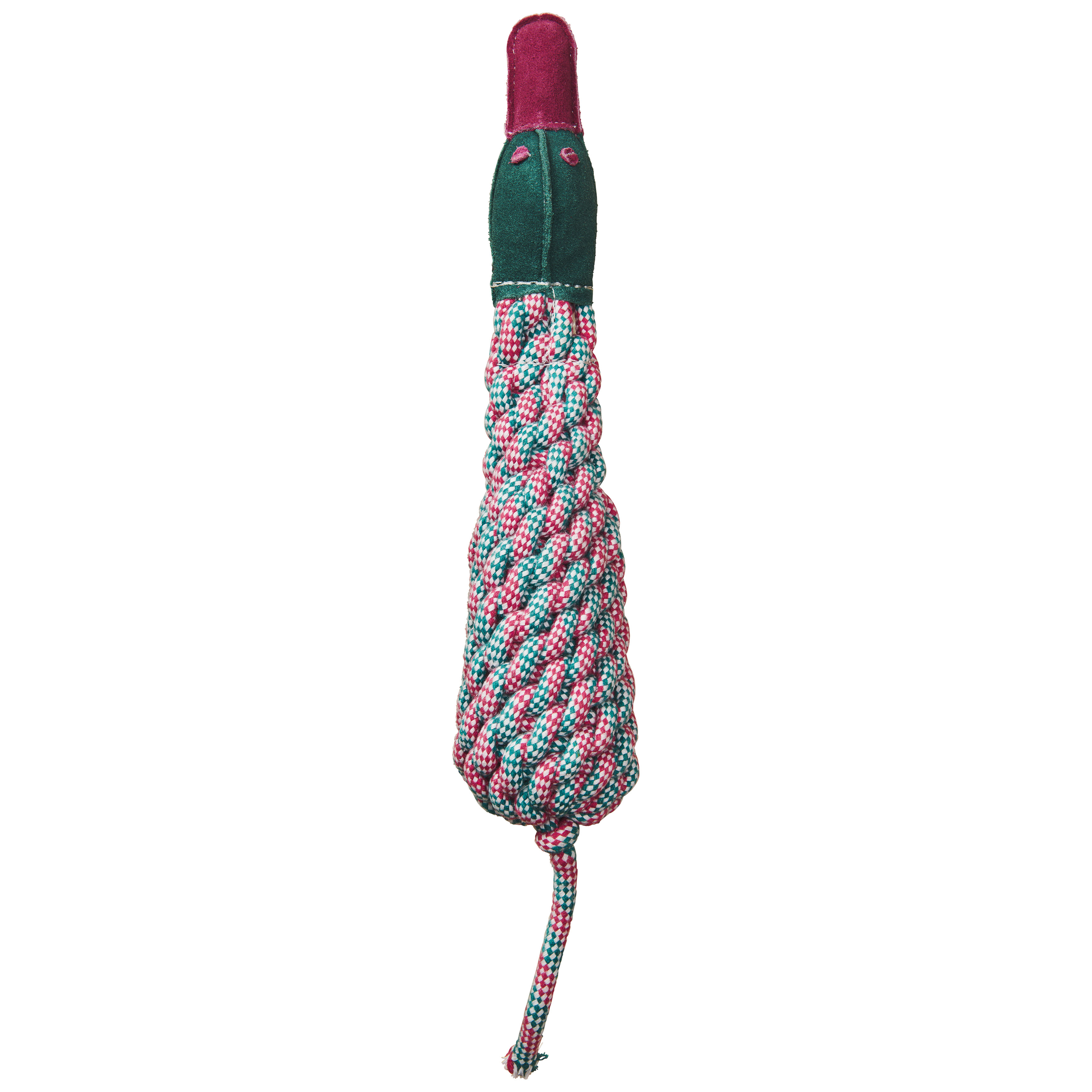 Dura-Fused Leather bottle Parrot combines the durability of leather and rope with a fun water bottle. Super durable leather and jute fabric fused together for added strength. Squeak and crunch sounds satisfy the natural hunting instinct and provides interaction and stimulation. 16" tall and easy to pick up for a fun game of fetch.