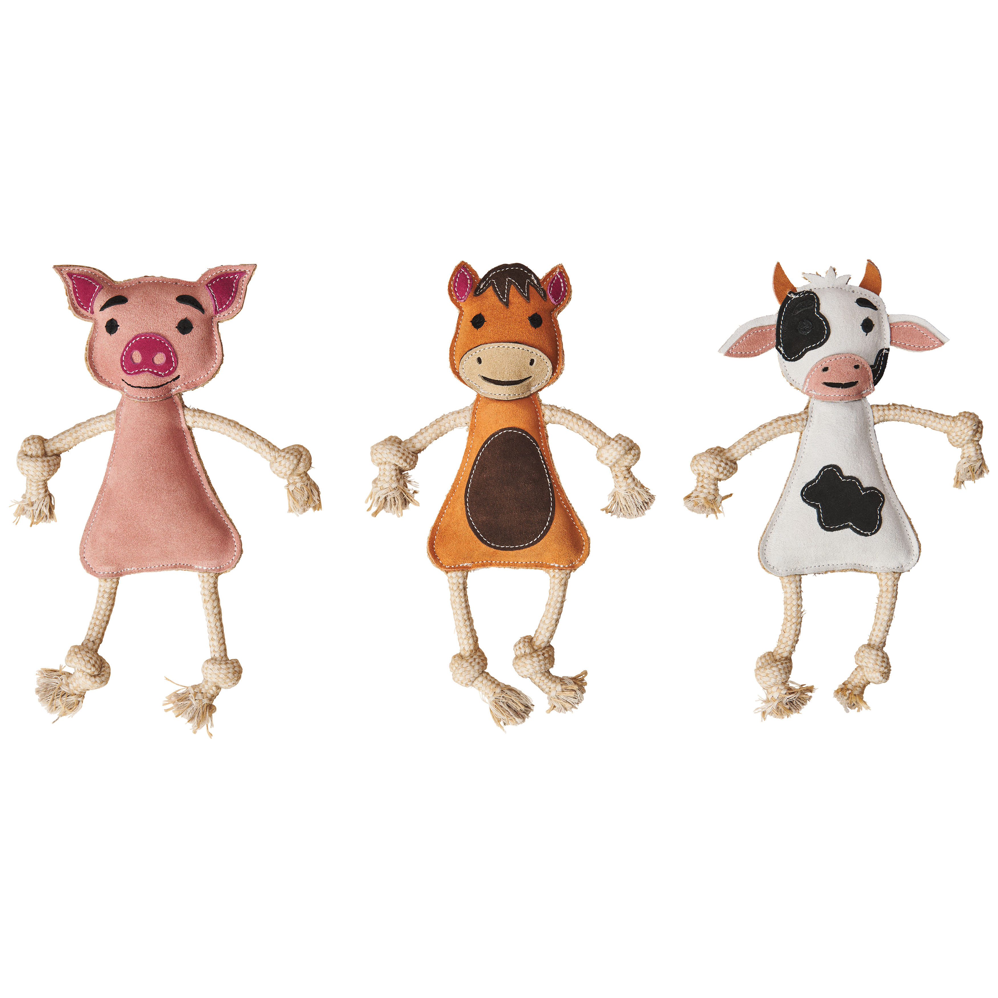 Dura-Fused Color Leather Barnyard toys will be your dog's favorite friends. Super durable leather and jute fabric fused together for added strength. Double stitched seams with heavy duty thread adds extra durability. Made from real leather, fully stuffed and a squeaker for even more fun.