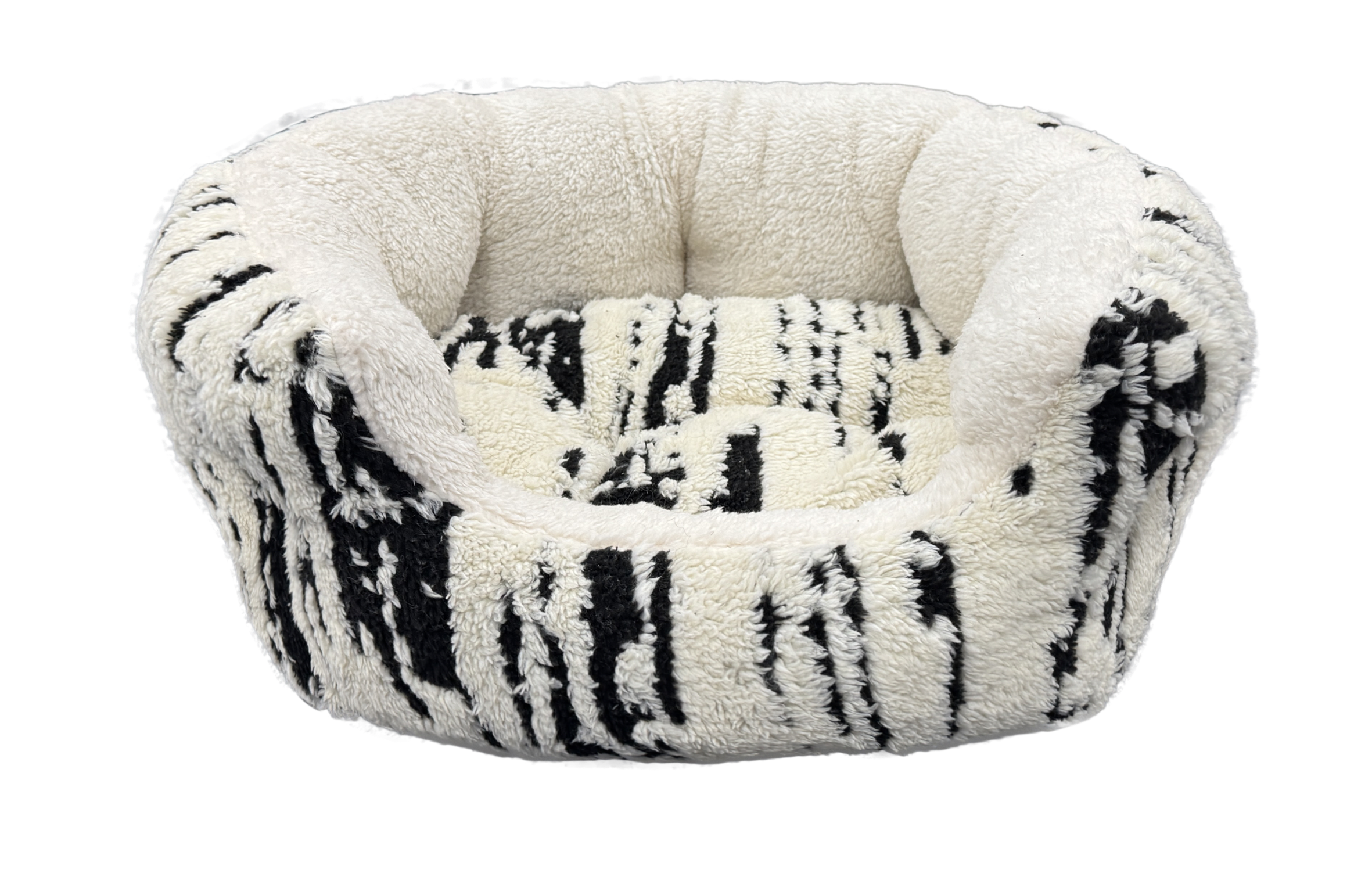 Jacquard sherpa bed featuring a classic black-and-white marbled pattern. Fully reversible with a double-sided cushion—patterned on one side and solid sherpa on the other—for versatile comfort. Designed with high walls for secure snuggling, generously stuffed for plush support and finished with a non-skid woven bottom. Machine washable and filled with recycled polyester made in the USA.
