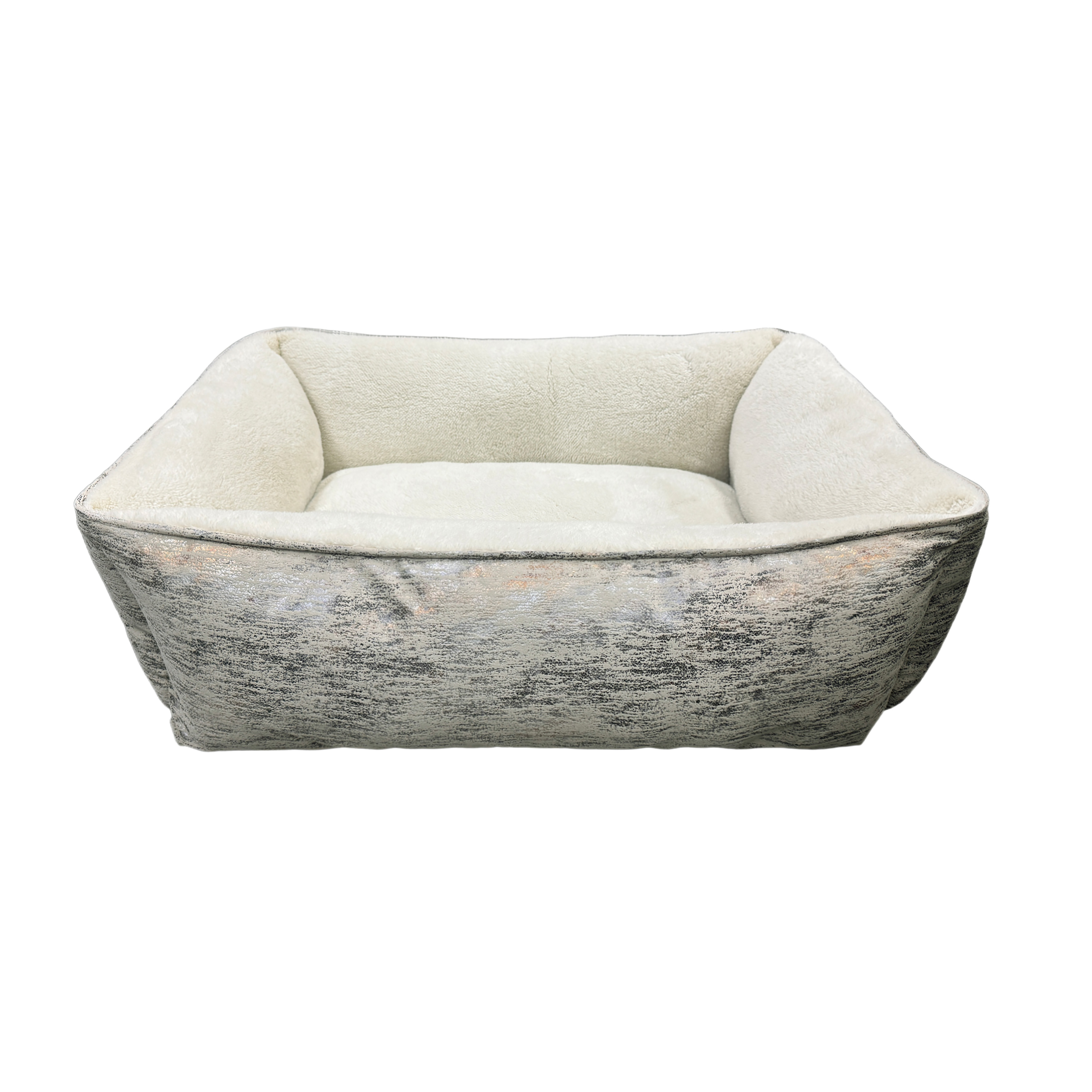 Foil-printed pattern adds a unique visual appeal, while the soft sherpa interior provides cozy comfort. Generously stuffed for supportive cushioning, this bed features a non-skid bottom and is machine washable for easy care. Filled with recycled polyester that is made in the USA. Measures 24" rectangular in taupe.
